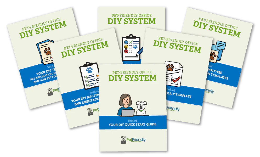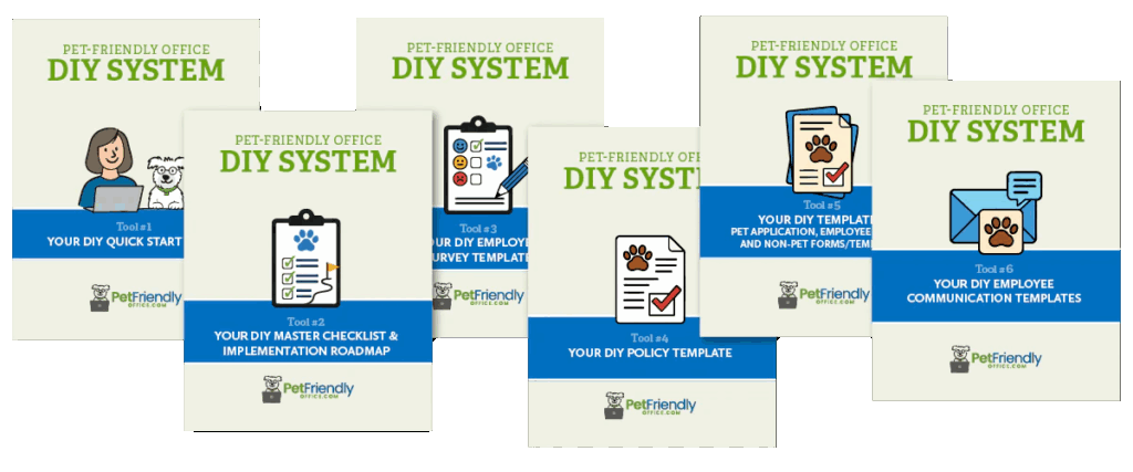 Altogether, the Pet-Friendly Office DIY SYSTEM (6 PDFs) gives you everything you need to create a pet-friendly office system … one that represents your compassion and commitment to your team’s emotional wellbeing.